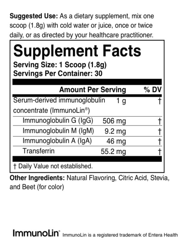 ImmunoLin® contains SBI- serum-derived bovine immunoglobulin isolate, sunflower lecithin, and an array of amino acids including alanine, arginine, aspartic