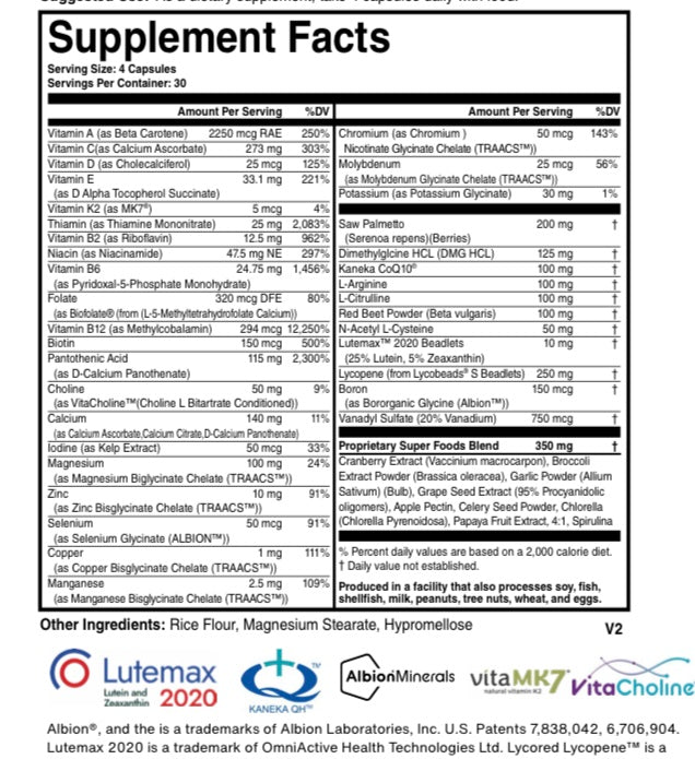 The Revitalize Men’s Complete formula contains powerful antioxidants including CoQ10, Vitamin E, Beta Carotene, Lutemax® 2020, DMG, and lycopene (from Lycobeads® S Beadlets). It also includes a high-ORAC superfood complex with cranberry, broccoli, garlic, grape seed extract, apple pectin, celery seed, chlorella, papaya, and spirulina.