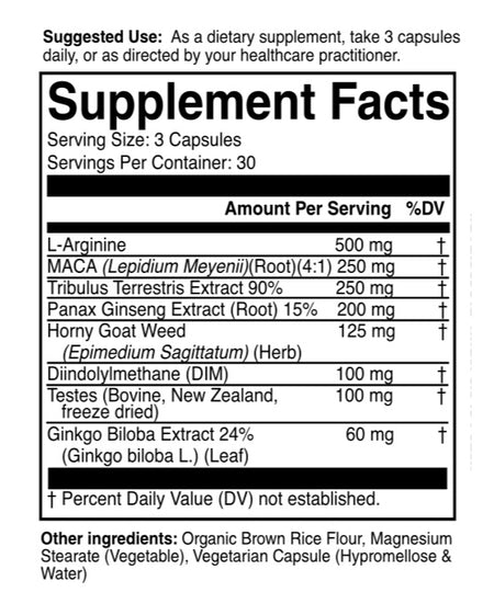 Men's Vitality supplement provides advanced reproductive health support for men. This formulation contains several agents to support sexual function and testicular health as well as enhance detoxification, and reduce free radical damage.* This comprehensive product contains L-arginine, maca root, tribulus terrestris extract, horny goat weed, DIM (diindoylmethane), ginkgo biloba extract, panax ginseng root, and bovine testes extract from Argentina.
