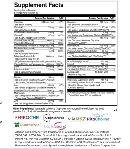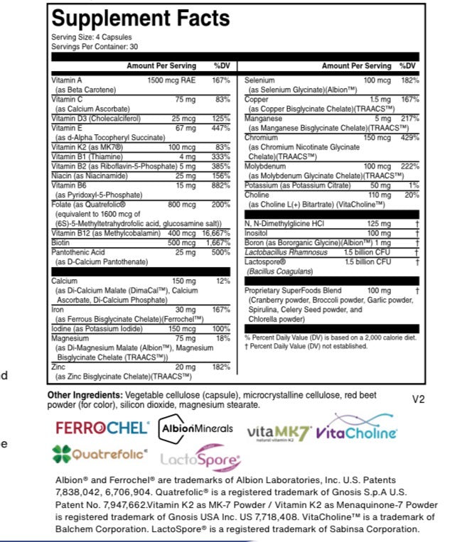 Each easy-to-swallow vegetarian capsule contains Patented, Researched, and Trademarked (PRT) ingredients for maximum effectiveness, including Quatrefolic® folate, vitaMK7® vitamin K2, TRAACS® chelated minerals, Ferrochel™ iron, Vitacholine™ choline, Lactospore® probiotics, and a high-ORAC superfood blend.